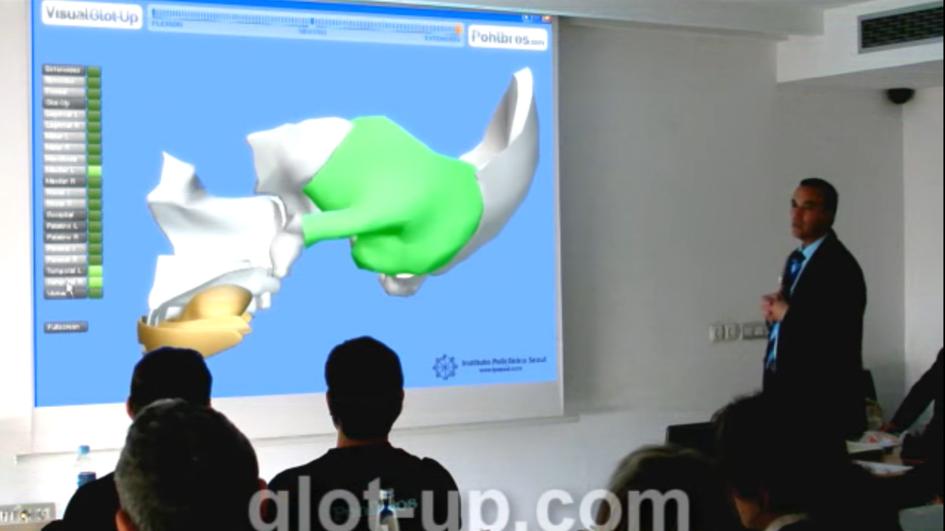 También presentó el protrusor bucal Glot-Up como medio de tratamiento exponiendo su funcionamiento y la acción que ejerce en la corrección de maloclusiones tales como el prognatismo, retrognatismo, diducción. Adicionalmente mostró ejemplos de su aplicación en oftalmología, en concreto la miopía y el alargamiento del ojo.